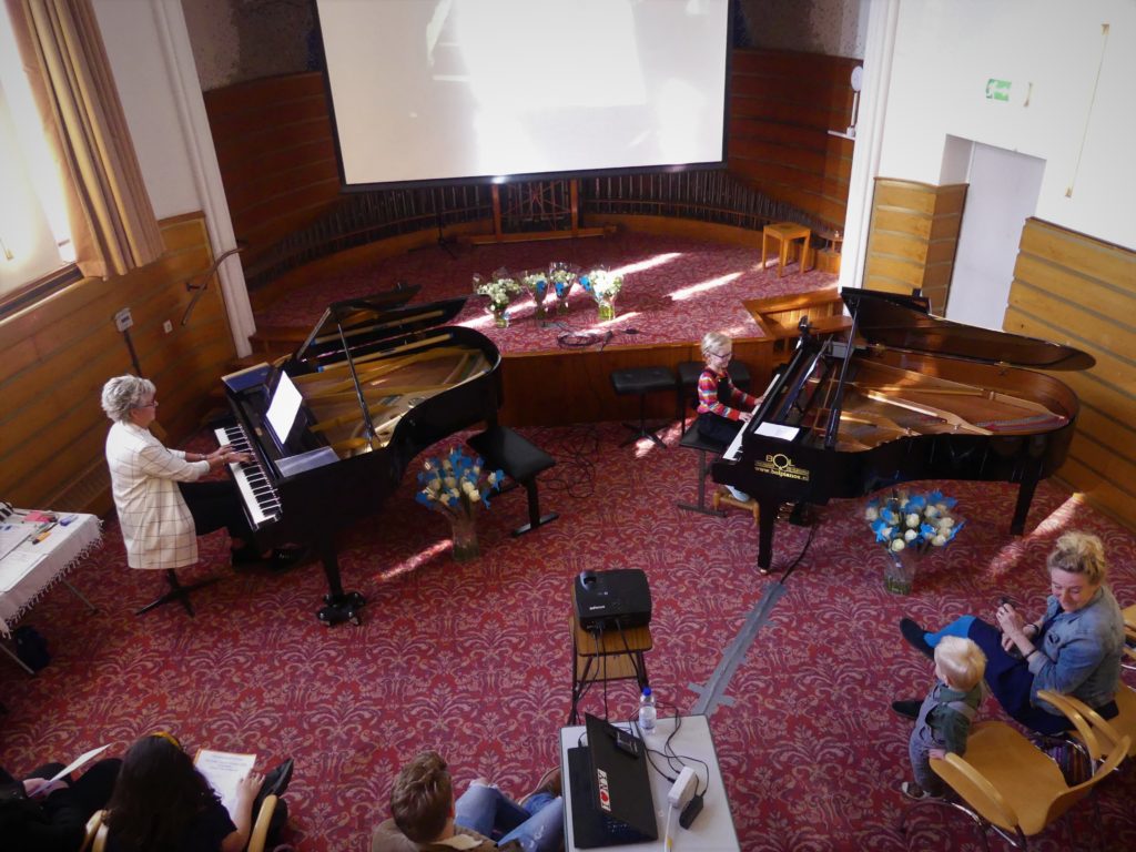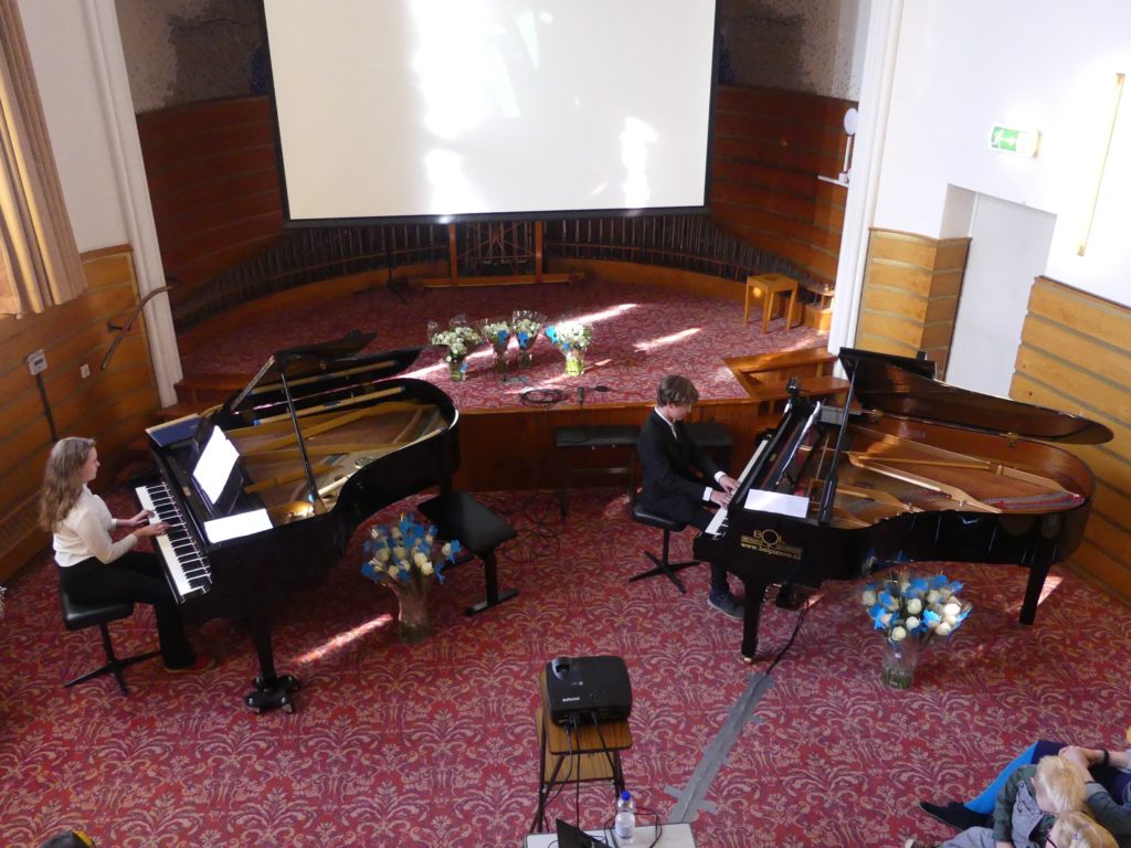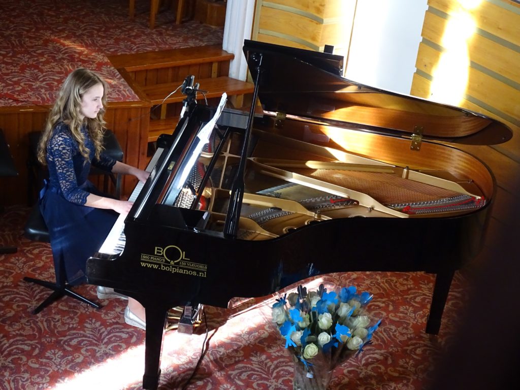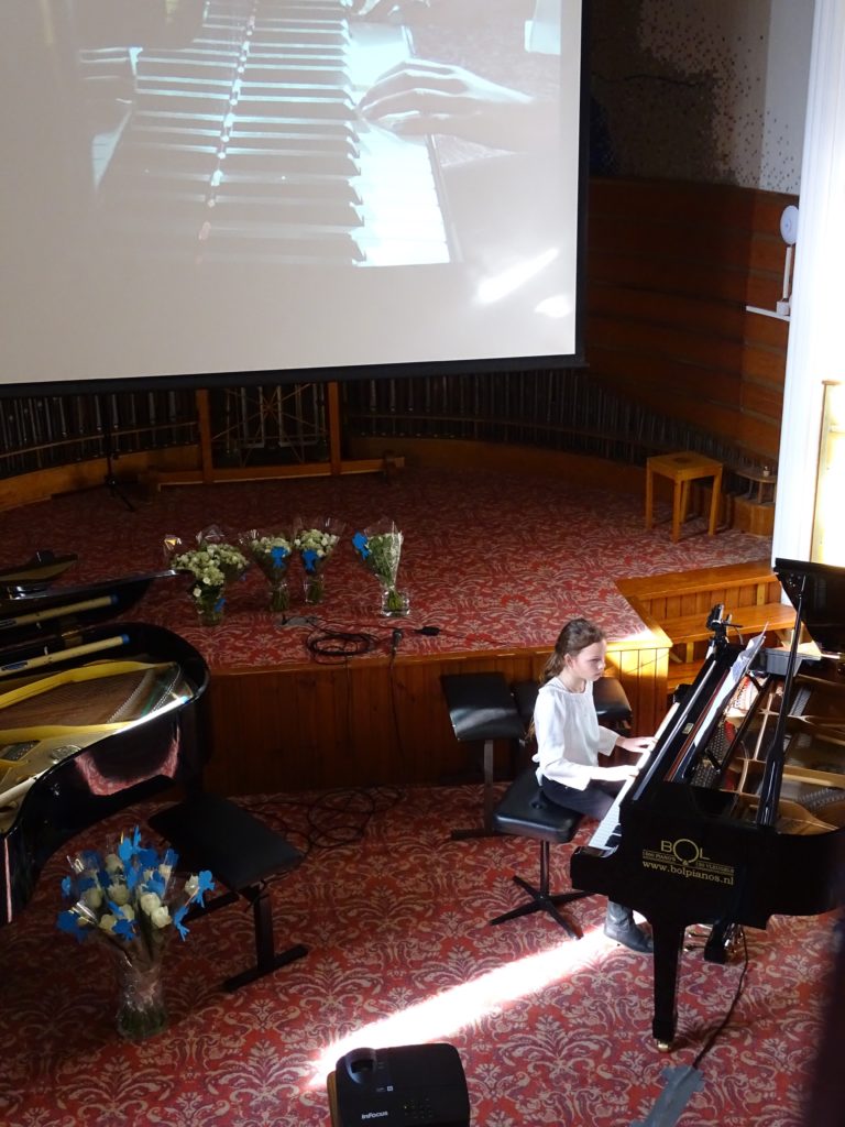 Het was weer een mooie mix van genres: van klassiek tot eigentijdse filmmuziek, van solisten en begeleiding van Dorrie op de tweede vleugel tot vier handen op één vleugel. In totaal traden er 25 pianisten op, waarbij twee jongedames wellicht het meest in het oog sprongen. Zowel Anoush als Tessa had ondersteunende beelden uit natuurfilms.
